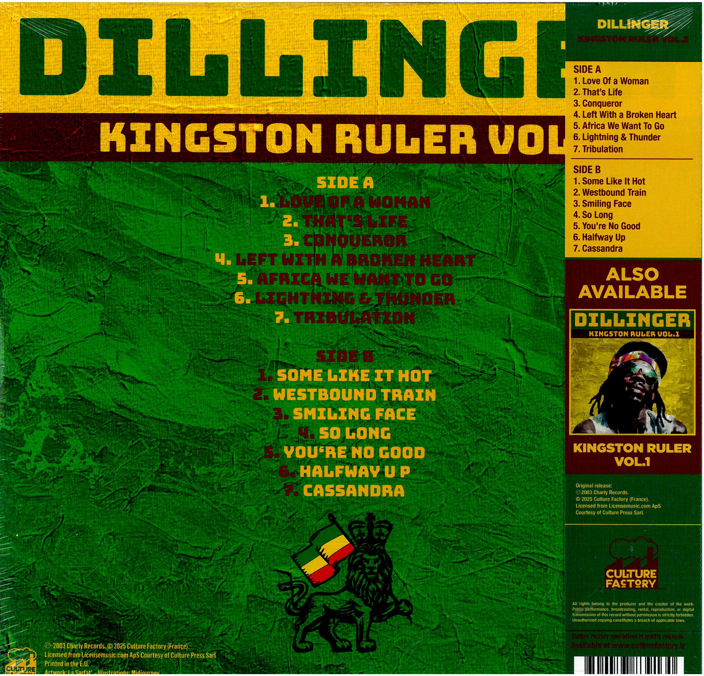 Το Kingston Ruler Vol. 2 του Dillinger είναι ένα αυθεντικό reggae / roots βινύλιο που εισάγει τον ακροατή στον πυρήνα της Τζαμαϊκανής σκηνής της δεκαετίας του ’70 και ’80 μέσα από τον χαρακτηριστικό deejay ρυθμό και το προσωπικό στιλ του Dillinger. Ο δίσκος αποτελεί συνέχεια της σειράς Kingston Ruler, που παίρνει το όνομά της από την πρωτεύουσα του reggae και του ska, και συγκεντρώνει επιλεγμένα κομμάτια όπου η φωνητική παρουσία του Dillinger – με το παιχνιδιάρικο αλλά άμεσο flow του, τις αυτοσχέδιες στιχουργικές γραμμές και την ξεχωριστή του χροιά – συνομιλεί με παλιές παραγωγές, dub ρυθμούς και βαριά μπάσα. Ακούγοντας το Vol. 2, ο ακροατής διατρέχει έναν μουσικό χάρτη που κυμαίνεται από πιο εμβληματικά tracks ροκάροντας στους σκληρούς ρυθμούς του roots reggae μέχρι πιο μελωδικές αλλά γεμάτες αύρα στιγμές, όπου η παραγωγή και τα όργανα αναδεικνύουν την απλότητα αλλά και τη δύναμη της μουσικής αυτής σκηνής. Το άλμπουμ λειτουργεί τόσο ως φόρος τιμής στην πολιτιστική κληρονομιά του reggae όσο και ως ιδανική εισαγωγή για κάποιον που θέλει να νιώσει την ενέργεια και το groove που καθόρισαν την Τζαμαϊκανή μουσική κουλτούρα — ένα βινύλιο με χαρακτήρα, ρυθμό και αυθεντικότητα που ακούγεται τόσο στον καθαρό ήχο όσο και στις ενδιάμεσες, παραδοσιακές νότες του genre.